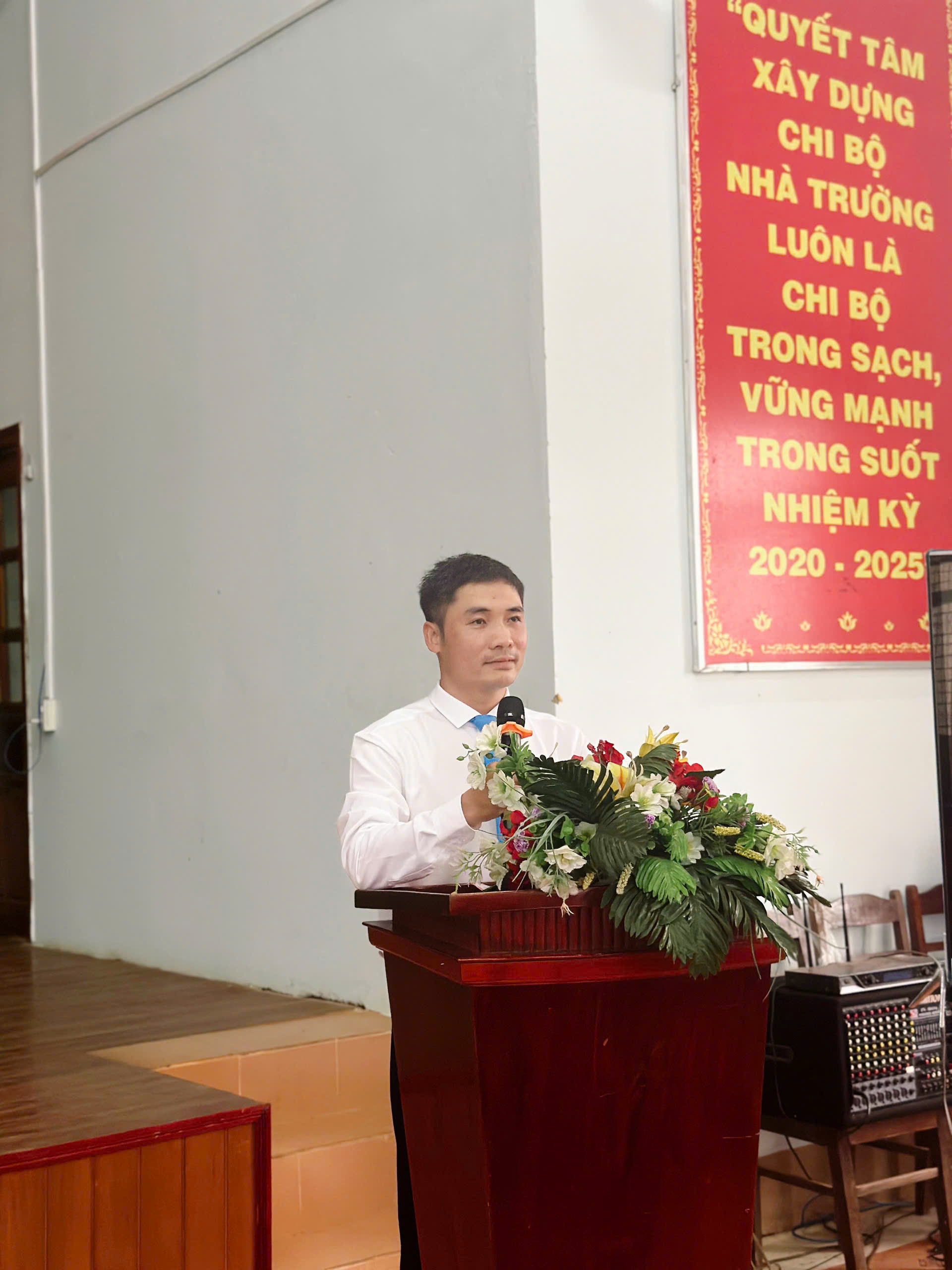 Thầy Lê Công Tùng, Phó bí thư chi bộ, Phó hiệu trưởng nhà trường báo cáo tổng kết phong trào thi đua năm học 2024-2025 và phương hướng năm học 2025-2026